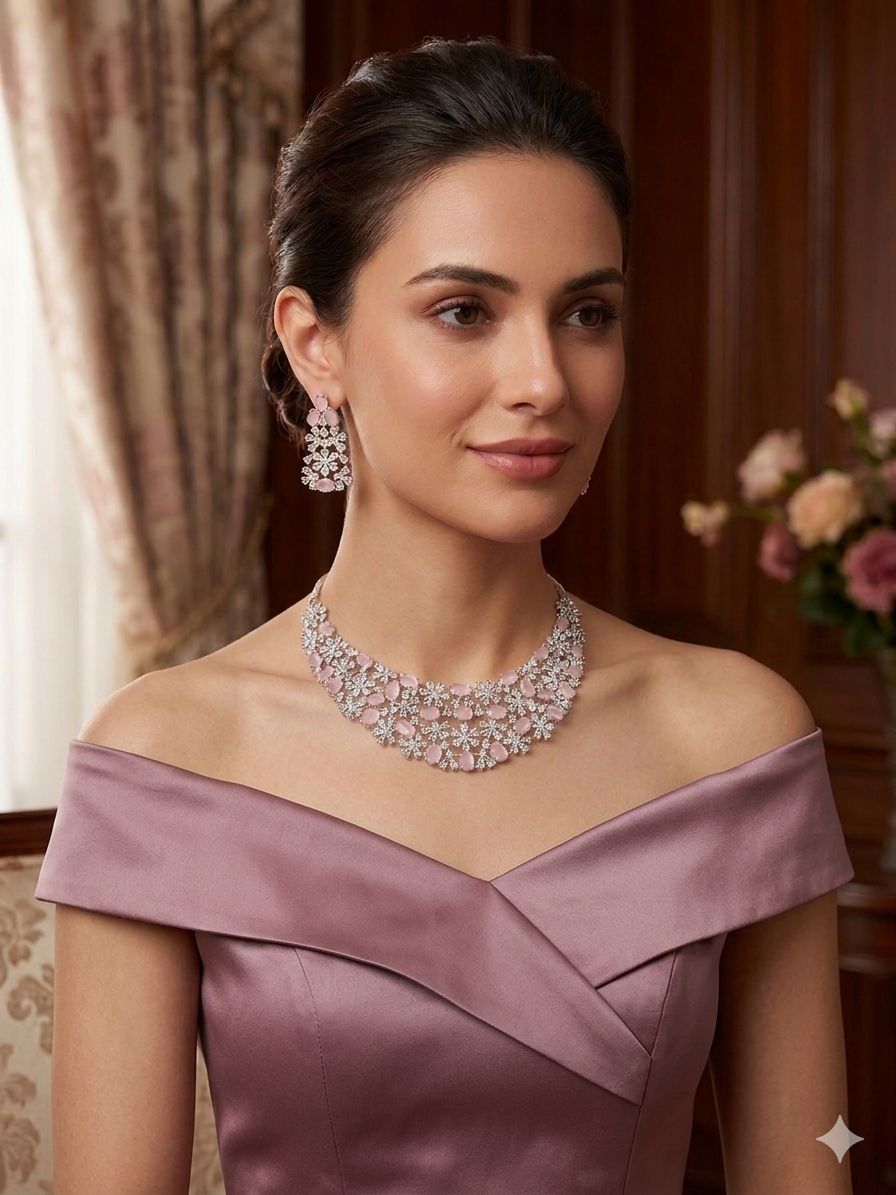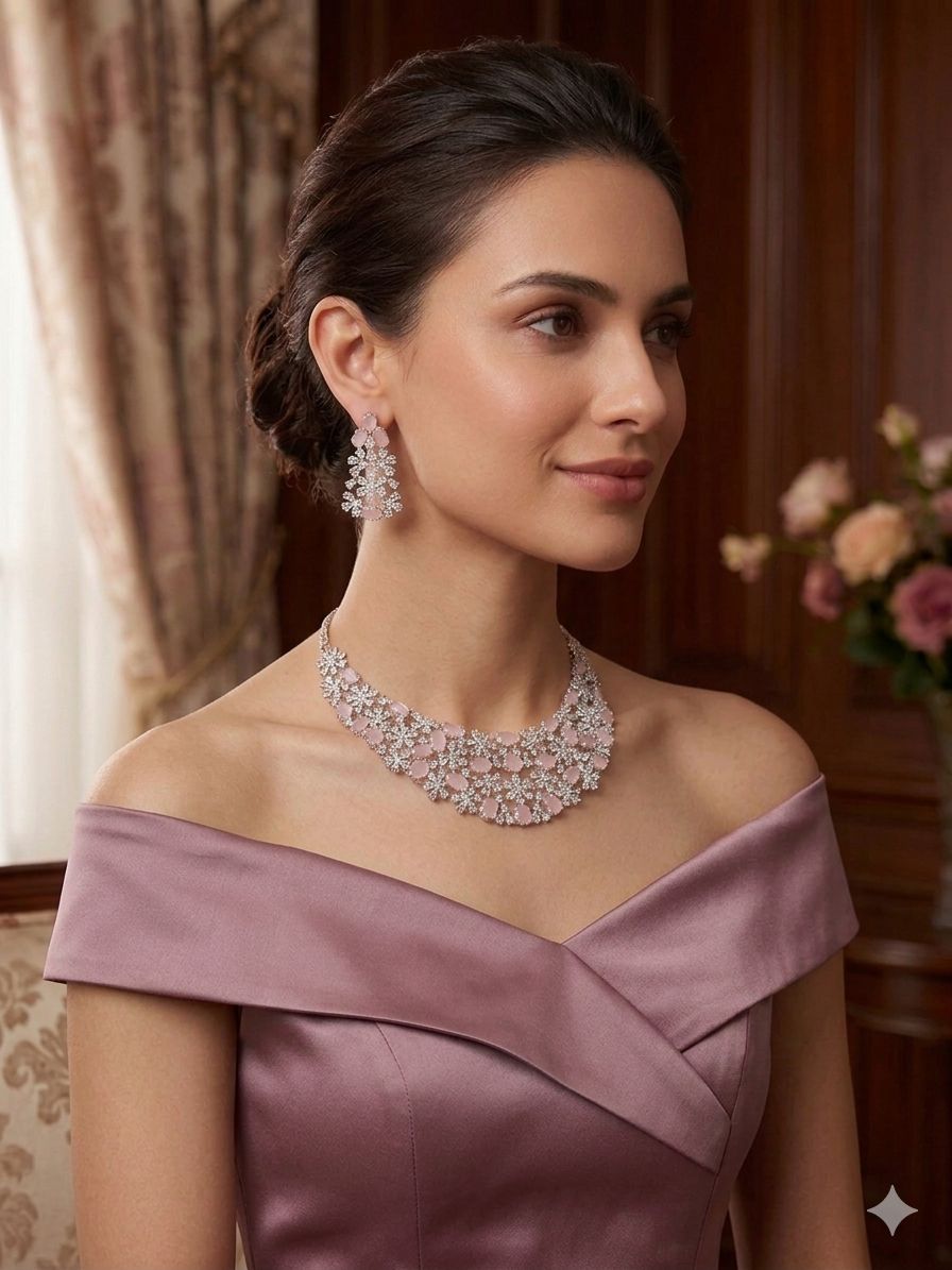 Paired with matching statement earrings that echo the floral motif, this set brings a harmonious and sophisticated finish to your look. The subtle pink hues combined with brilliant sparkle make it a perfect choice for romantic evenings, weddings, receptions, and festive celebrations.