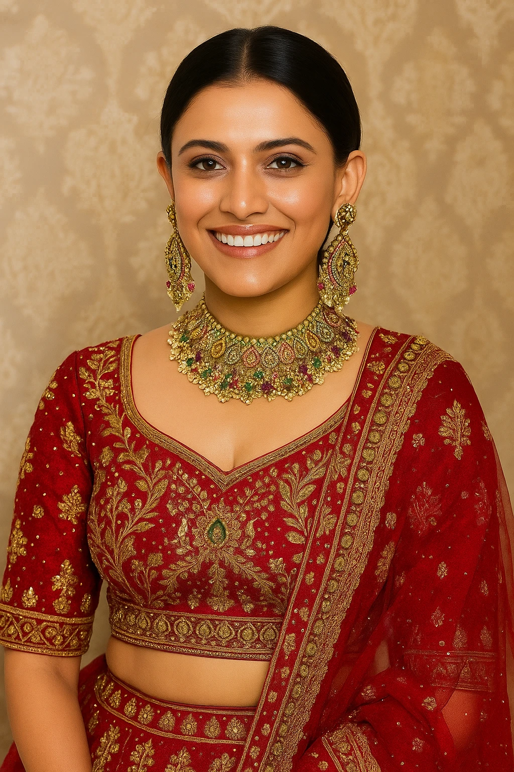 Celebrate tradition with a touch of royalty through our Ruhani Antique-Toned Festive Set. This beautifully crafted choker necklace is designed in a rich antique gold tone and adorned with intricately arranged red and green accents. Inspired by classical Indian motifs, the design features ornate peacock and paisley patterns, making it a perfect blend of heritage and modern-day elegance.